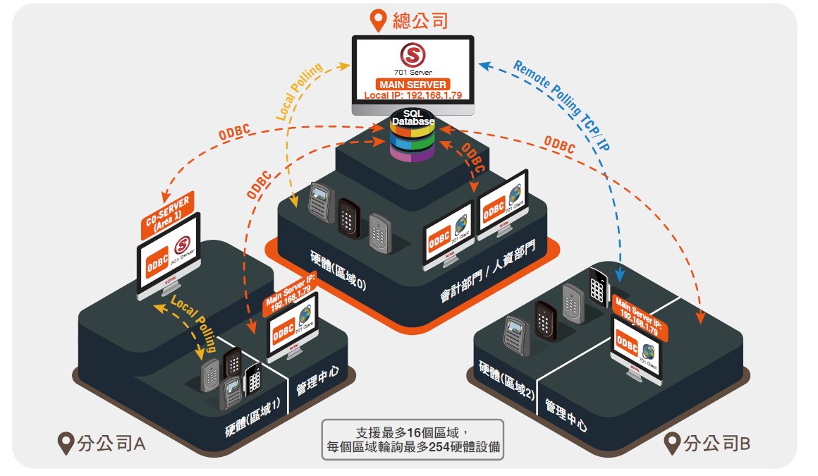 啟用Database模式時,701Server伺服器可支援多部遠端701Client同時連線,達到企業總部與全球據點統一管理的功能,透過當地或遠端的701Client可與系統即時同步編輯、取得即時狀態、產出報表。