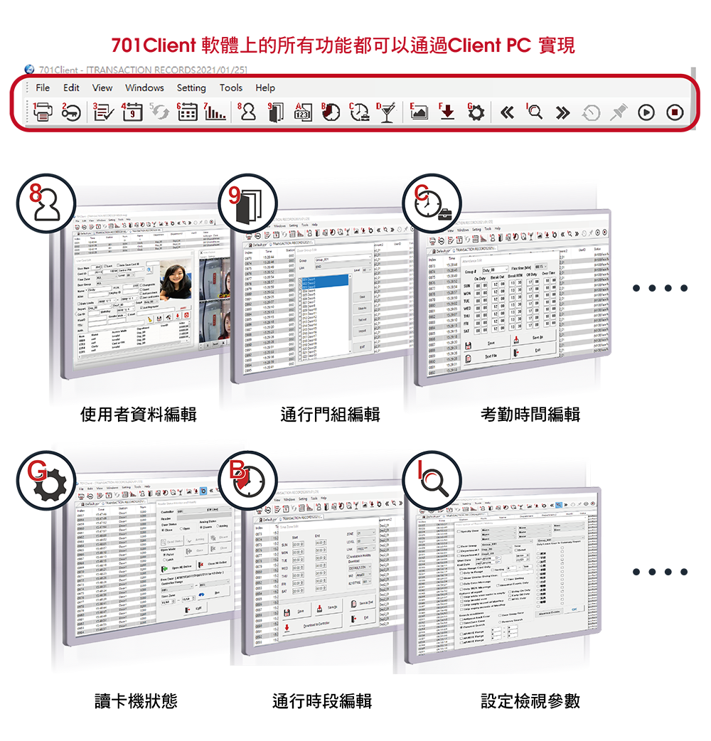 ◎門禁人員資料、通行門組、管制時段、資料及上下載操作介面