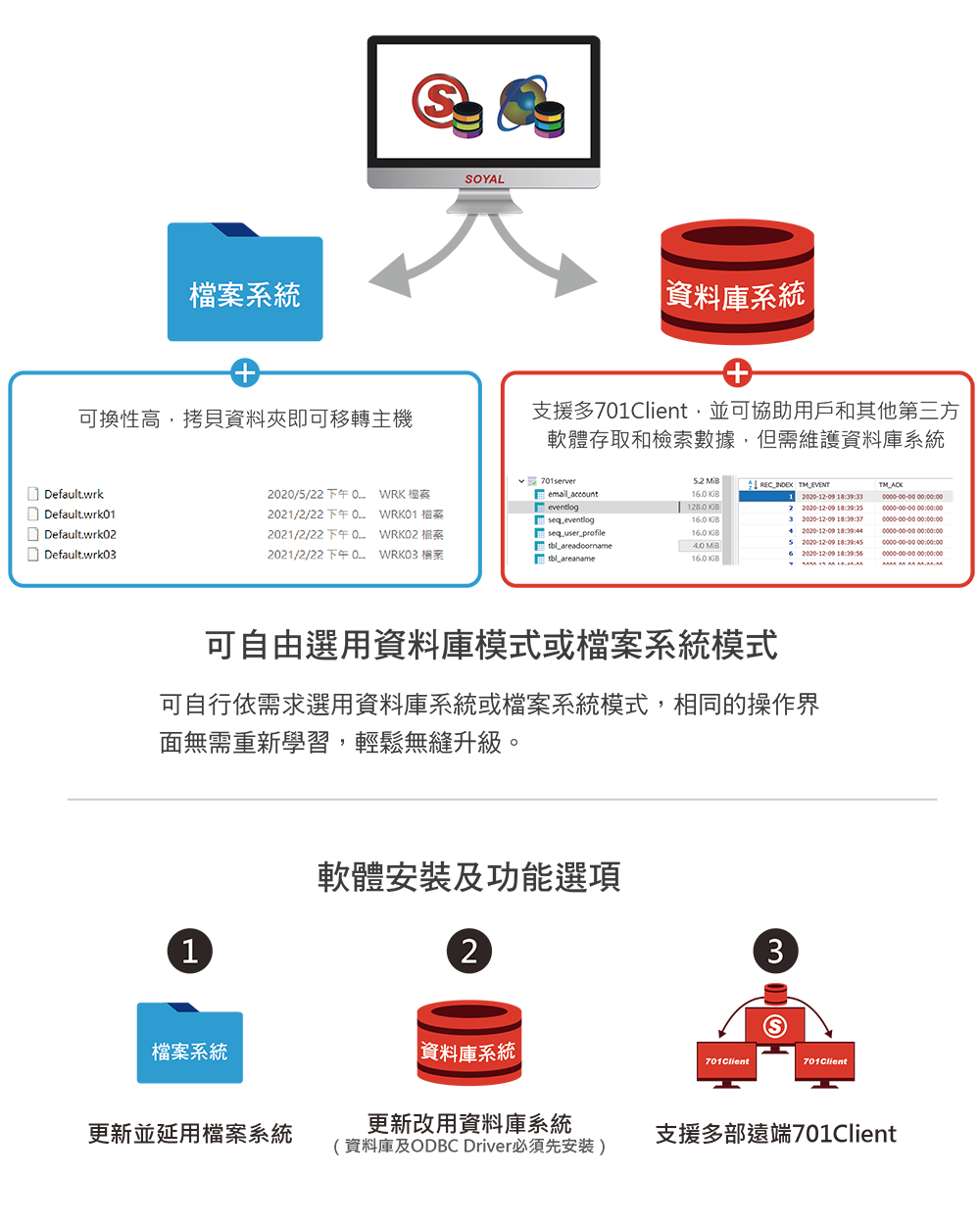 用戶可依照需求自行選用資料庫模式或檔案系統模式,相同的操作界面能無縫升級,無需重新學習,且可以輕鬆地從檔案系統升級到資料庫。